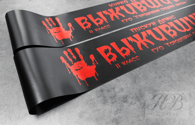 На фото: цвет ленты черный, цвет надписи красный металлик.